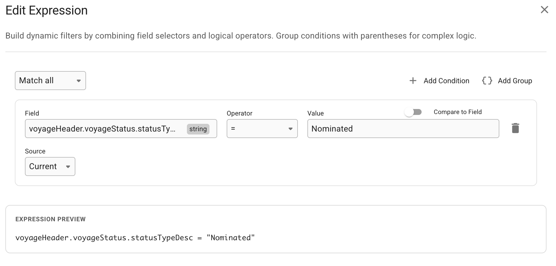 Notice the expression preview: voyageHeader.voyageStatus.statusTypeDesc = "Nominated"