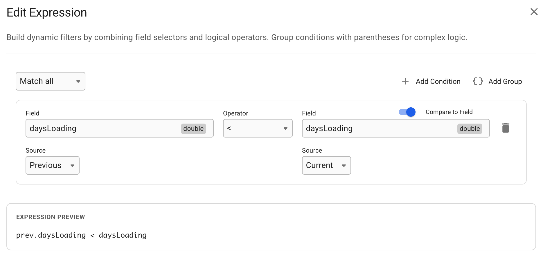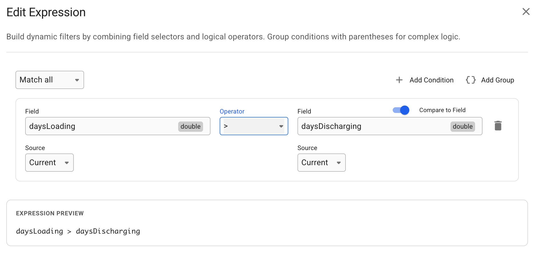 Instead of comparing to a static value, you can compare one field to another field by toggling **Compare to Field**.