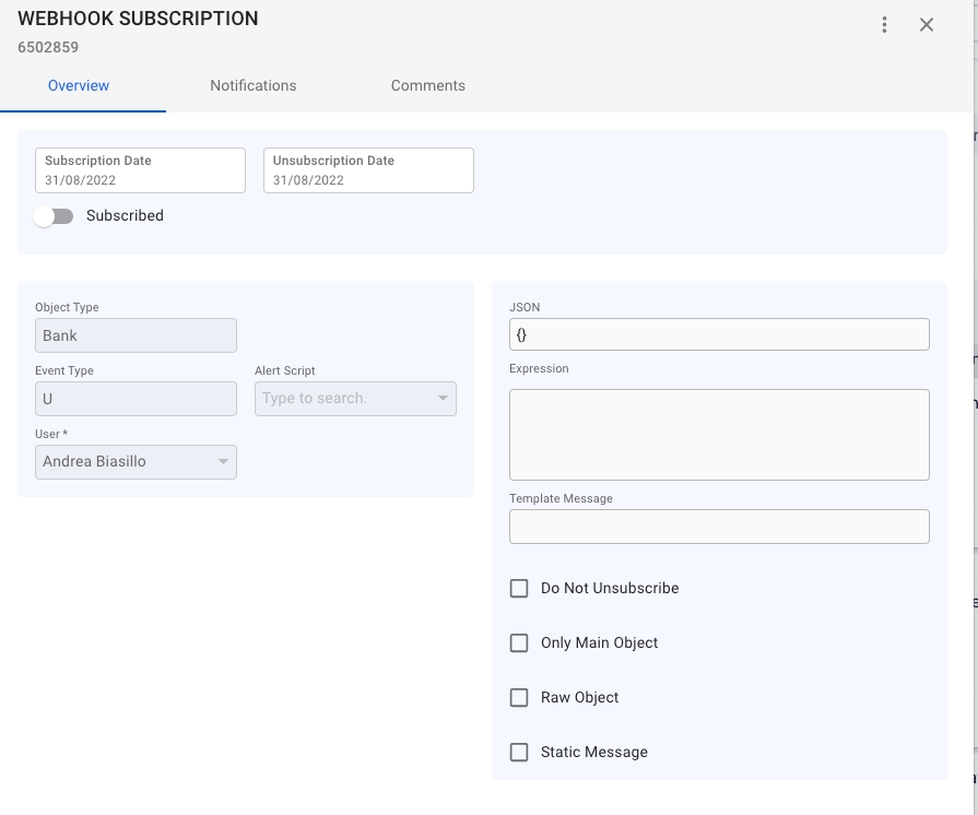 Clicking one of the rows in webhooks, opens the webhook subscription drawer with three tabs - Overview, Notifications and Comments