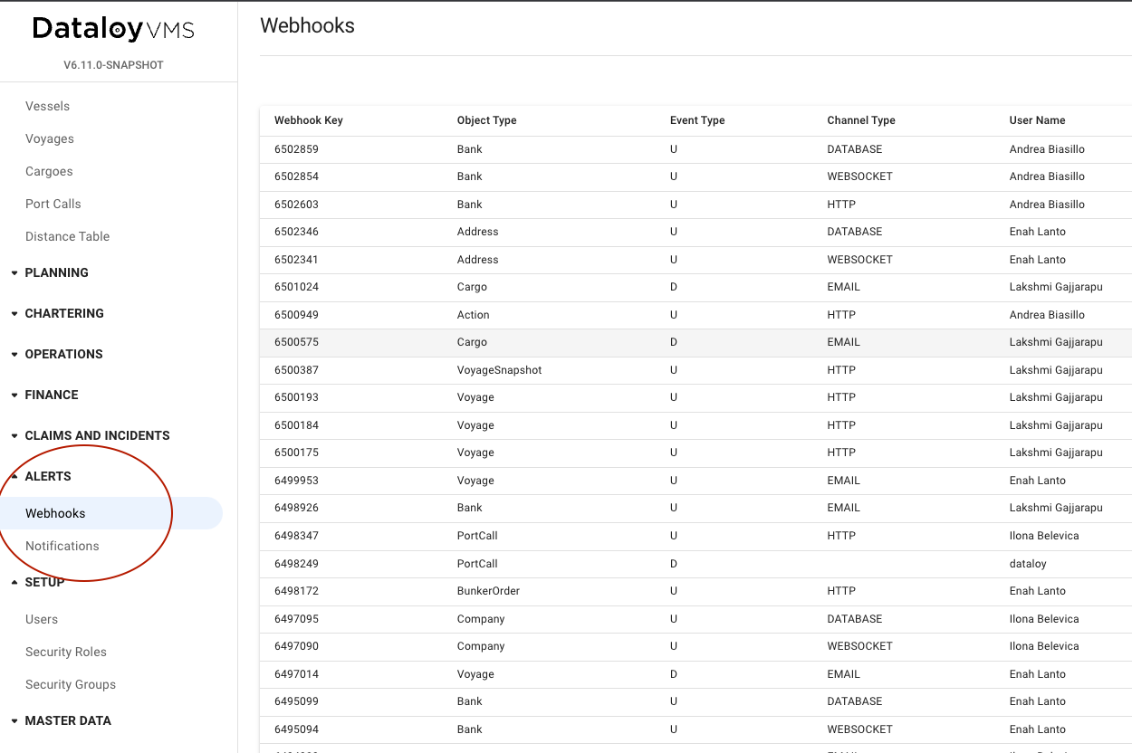 Webhooks - shows the list of subscriptions made by the user if the user is a non-administrative role and shows all the subscriptions in the system for an administrator user