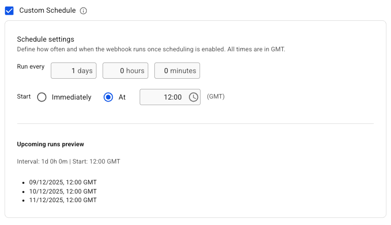 Webhooks can be set to trigger automatically on a set schedule with the **webhookSchedule** attribute (only possible on Webhooks with Alert Scripts).