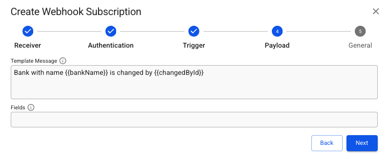 For example, when creating a subscription on Bank object , the user can use a templateMsg like *‘Bank with Name {{bankName}} is changed by {{changedById}} .*