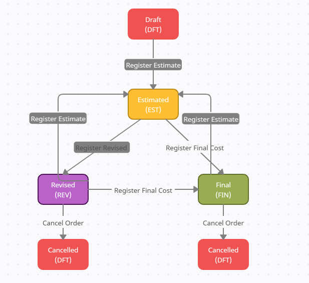 ServiceOrder objects are created by Dataloy VMS with the status Draft, status code DFT.